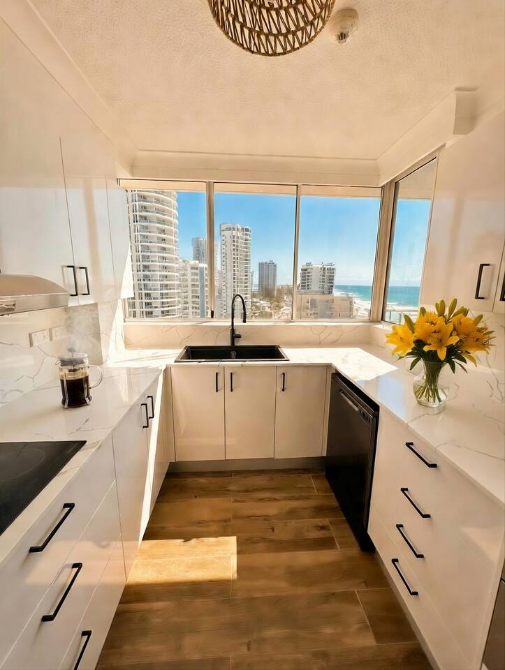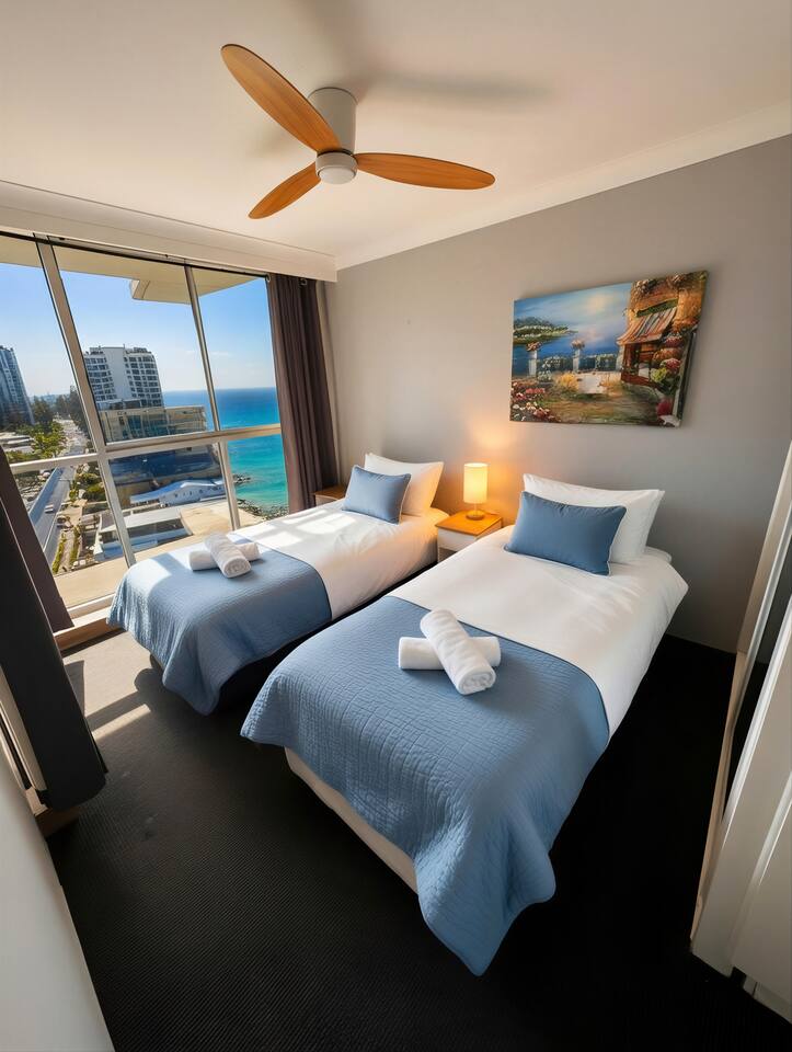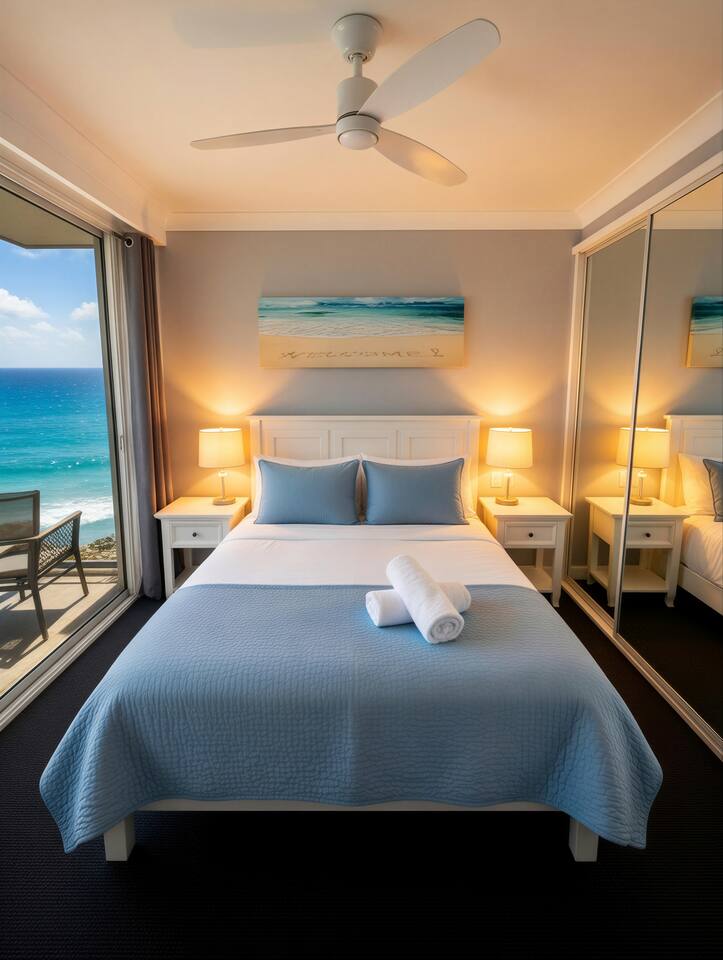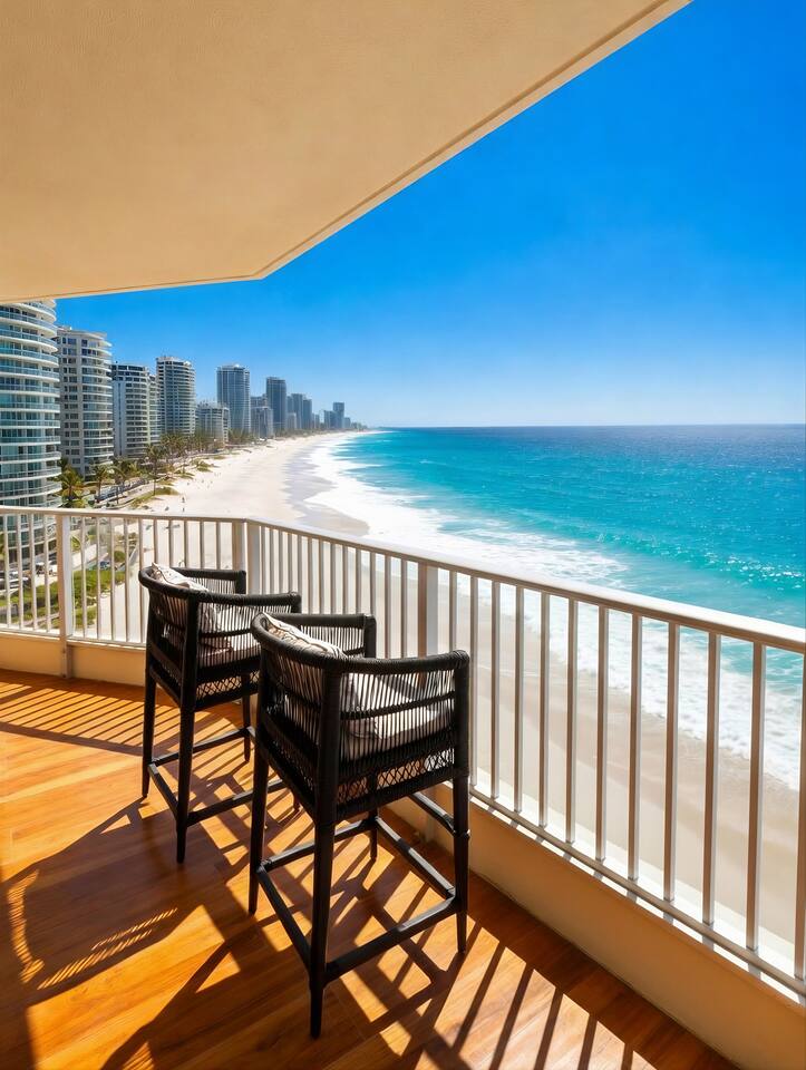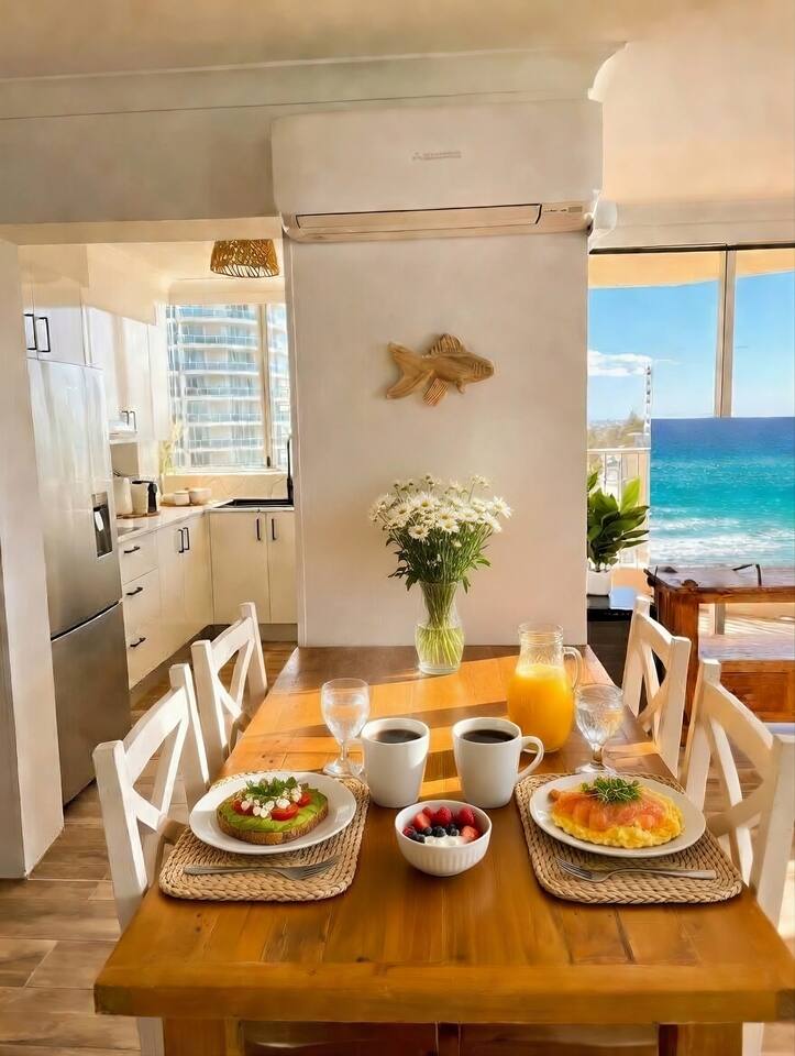 Guests consistently mention: • Uninterrupted ocean views from the living room, balcony and master bedroom • Peaceful Main Beach location — close to Surfers Paradise without the noise • Stylish renovation with premium finishes Absolute beachfront apartment with uninterrupted ocean views from your private balcony. Step straight onto the sand, watch the surf roll in, and enjoy sunset drinks from your balcony bar. This beautifully renovated 2-bedroom, 2-bathroom apartment offers relaxed coastal living with a heated pool, direct beach access and everything you need for a comfortable stay — just a short walk to Tedder Ave cafés and dining. Sleeping Arrangements Master bedroom: Queen bed, ensuite and ocean views (sleeps 2) Bedroom 2: Two single beds with built-in storage (sleeps 2) Living area: Double sofa bed (sleeps 2) Living & Comfort • Air-conditioned throughout • Fully equipped kitchen with stainless steel appliances and Nespresso machine • Comfortable open-plan living and dining area Entertainment • 75” 4K Smart TV with Foxtel Platinum, Netflix and Amazon Prime • Fast Wi-Fi (100+ Mbps) and dedicated workspace Outdoor & Location • Direct access to a patrolled beach • Heated outdoor pool and BBQ area • Balcony dining with bar seating overlooking the ocean • Short walk to Tedder Ave cafés, restaurants and The Spit Perfect for Couples, families and beach lovers looking for a relaxed, beachfront stay with everything close by.