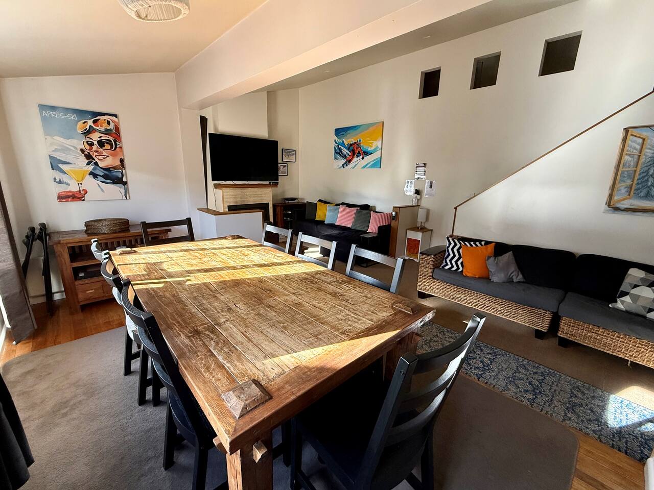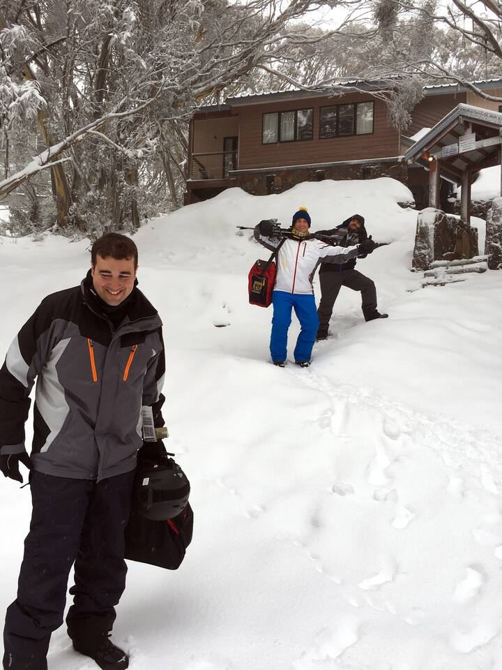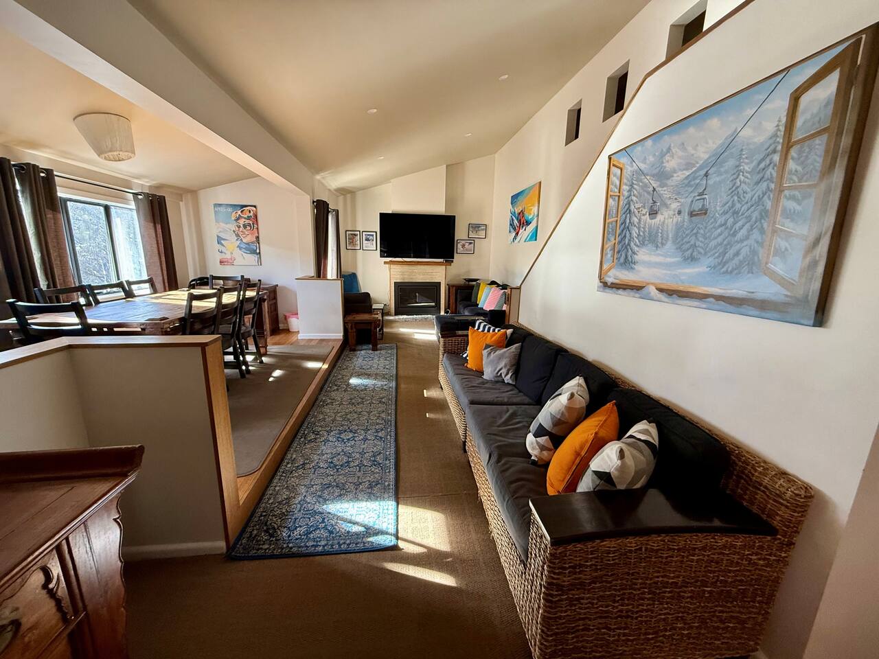 Luxury chalet with, 75″ TV, fast Wi-Fi & ski lift 5min walk! Sleeps 14: 3BRs + sofa beds, bunk beds. Full kitchen, cot, work setup, Foxtel & Netflix Perfect for families or group ski trips!